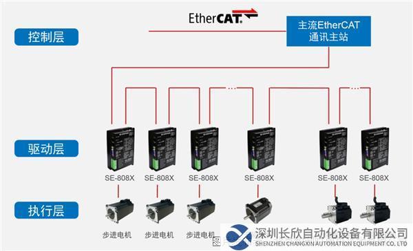 SE-808X系列是北京和利时电机公司在二十多年步进驱动器的研发基础上,融合EtherCAT总线技术打造的高速总线型数字同步电机驱动产品。它支持COE(CANopen over EtherCAT)协议,符合CiA402标准,总线传输速率可达100Mb/s,可实现步进/伺服系统/直流无刷系统的实时控制与实时数据传输,具有高性能、高传输速率、高可靠性通讯等优点。 同时由于控制器、驱动器之间采用网线连接,大幅度减少线缆成本、人工成本、维护成本等,保障了整机的降本增效,提升了设备的议价空间。