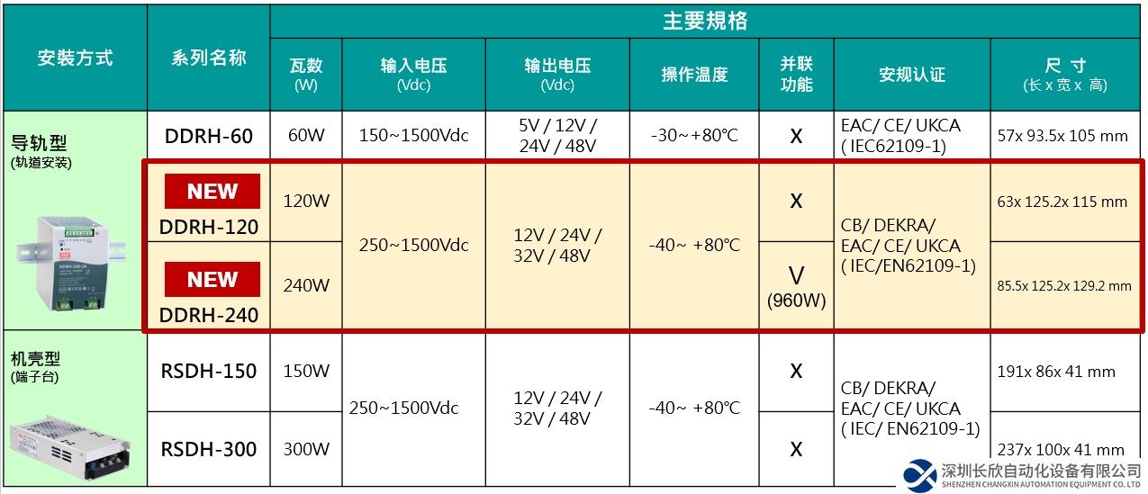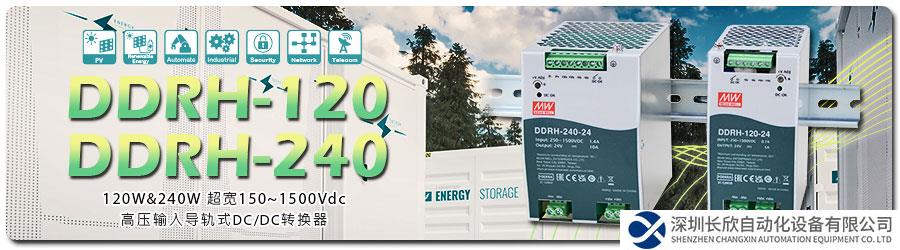 近年来光伏、储能…等再生能源相关行业需求骤增,明纬继推出DDRH-60、RSDH-150/300后(详如下表),紧接着新上市120W/240W超宽250~1500Vdc高压输入导轨式DC-DC转换器~ DDRH-120/240系列。