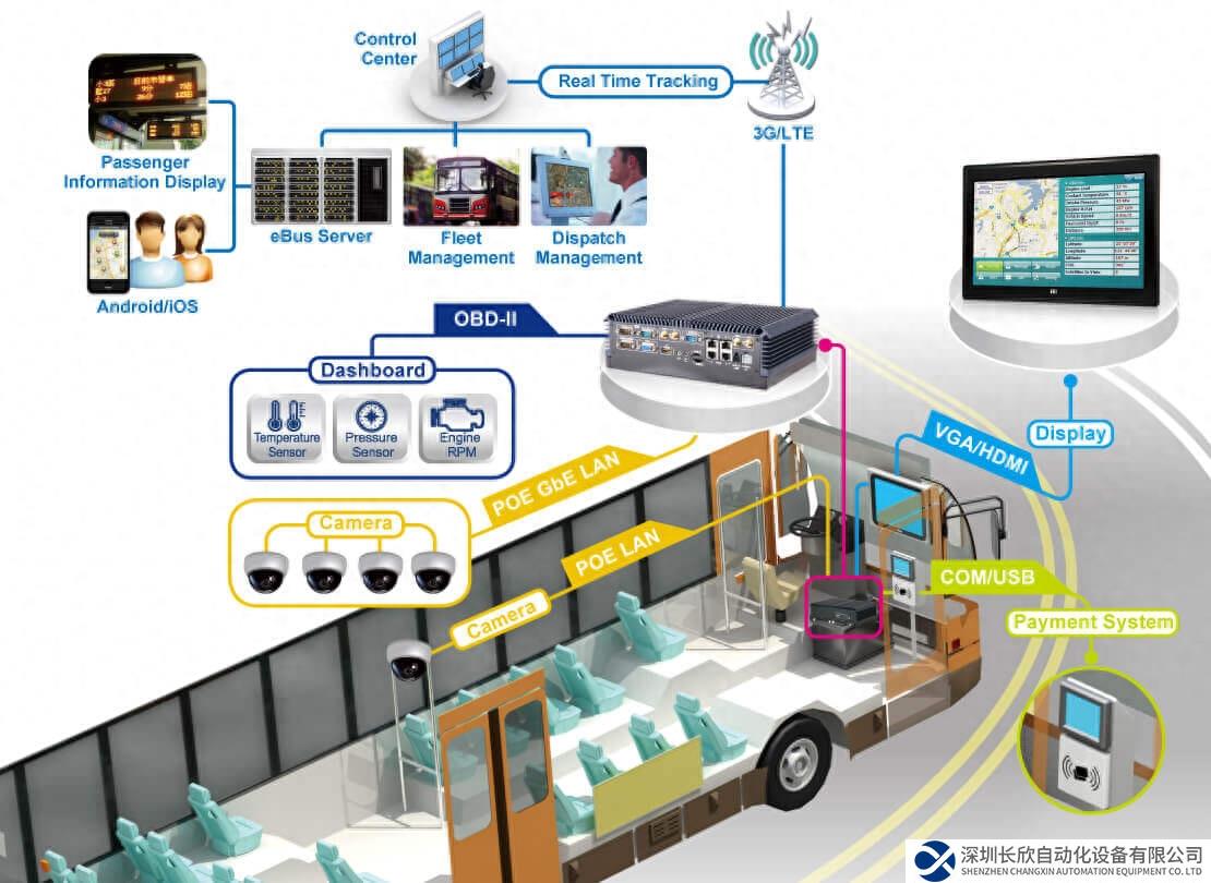 智能公交车系统,包括安装于每辆公交车上的视频监控、乘客信息系统、交通信息系统以及与数据处理系统。我们的车载电脑系统能够不受任何限制地应用在巴士、出租车与卡车上。