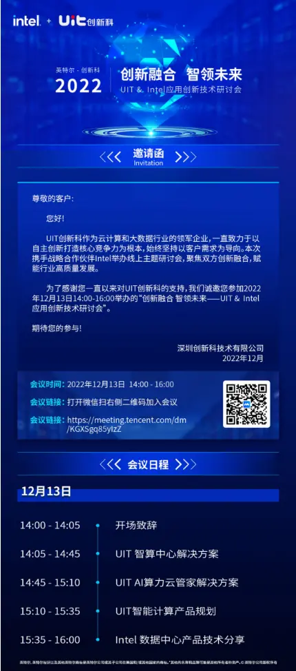 2022年12月13日14:00-16:00,UIT创新科将携手Intel,邀您一起,齐聚云端,分享数字化转型的创新实践,探索新格局下双方创新融合的升级之道。