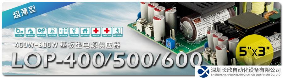 明纬超薄基板型电源供应器 LOP 家族甫上市 4" x 2" 200W / 300W 的 LOP-200 / 300 系列后,紧接着又重磅新推出了 5" x 3" 400W / 500W/ 600W 的 LOP-400 / 500 / 600系列,本家族是一系列高可靠、高质量、高效能、安全性高、EMC 性能好、Class I 或 II 系统皆可使用的高性价比内置式基板型电源,非常适合安装于各种电子仪器设备内。