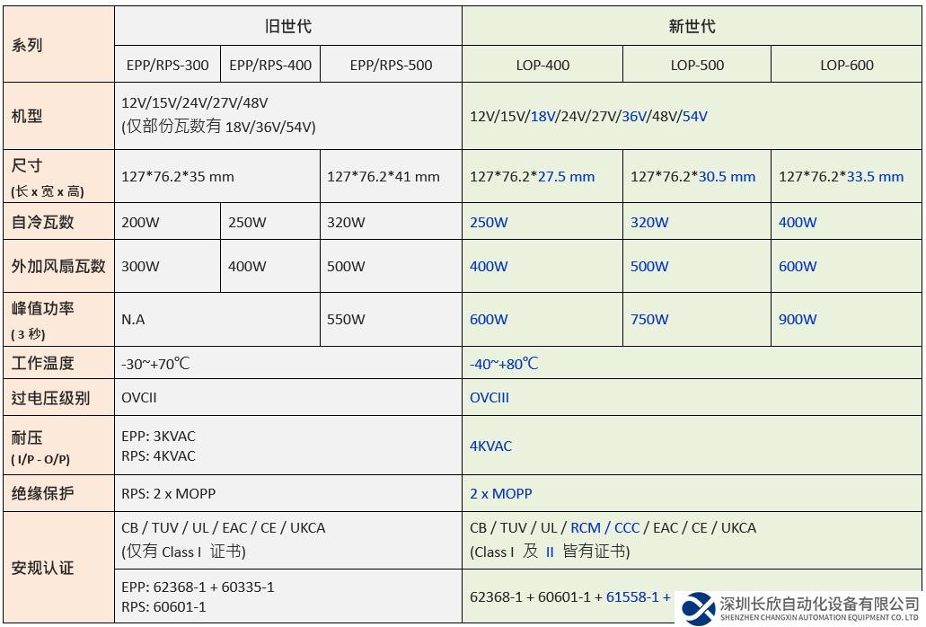 LOP-400 / 500 / 600 系列相较于销售中 EPP / RPS-300 / 400 / 500 系列,主要差异: 采薄型化设计 (1.08"~1.31" 高)、12~54V 电压更齐全、 5" x 3" 尺寸下功率推升至 600W、具备 150% @ 3 秒供载能力、-40~+80℃ 更宽工作温度、符合 OVCIII、2xMOPP 并适用医疗 BF 类、一机同时申请 62368-1 / 60601-1 / 61558-1 / 60335-1 多领域安规,涵盖应用范围非常广泛且可满足需求更高功率之应用,适用于通讯、网络、医疗、工控、安防、智能家居…..等各种领域。
